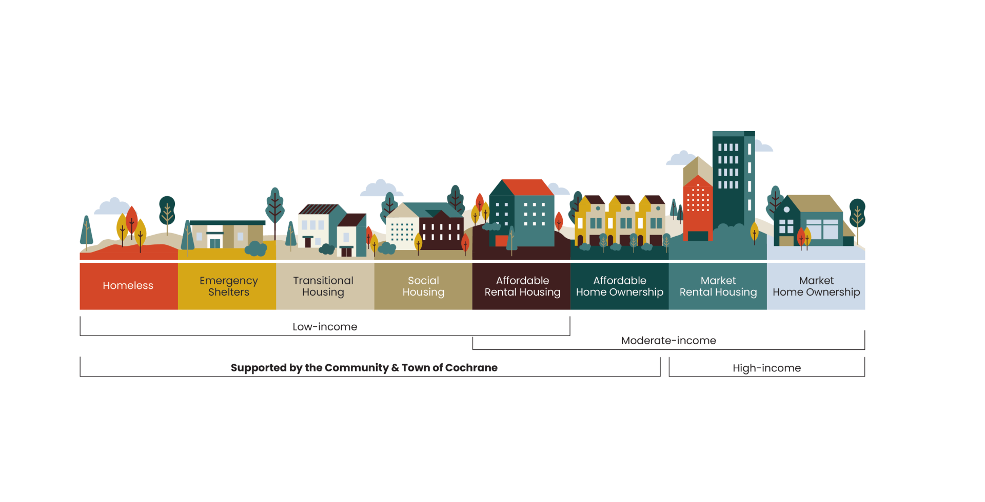 The areas of the housing spectrum supported by community agencies and facilitated by the Town of Cochrane include: