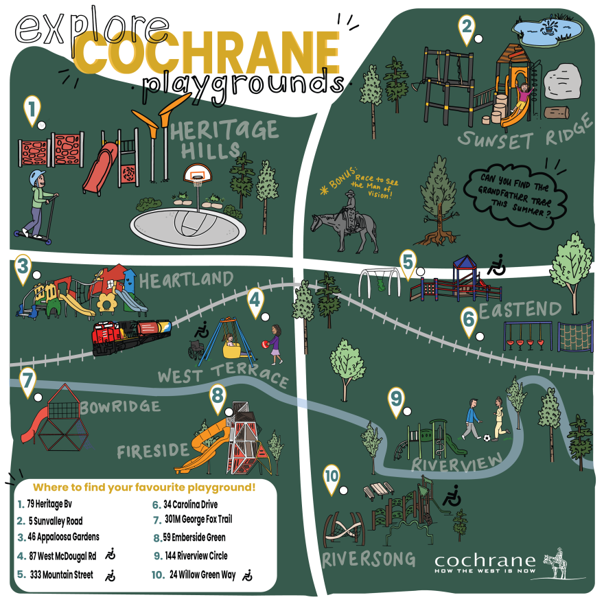 Our beautiful community is home to exciting playgrounds, perfect for family outings, playdates and exploring. Discover the joy of Cochrane’s playgrounds, where kids and families of all abilities can learn, play and grow together.