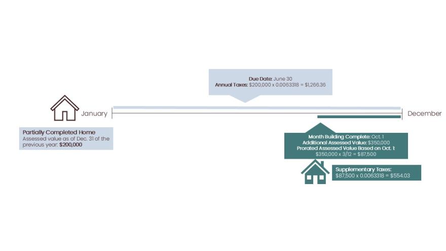 The supplementary tax is based on the increase in property value between the property’s annual assessment (value as of the prior year-end) and the value upon completion or occupancy.