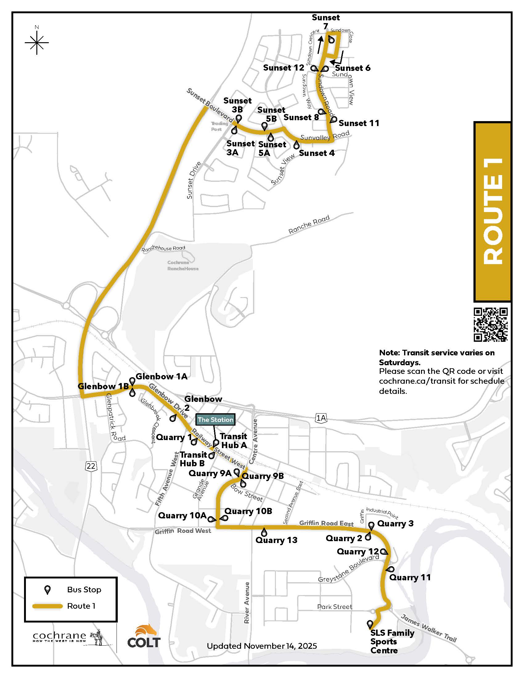 Route 1: Sunset Ridge → Downtown → SLS Centre